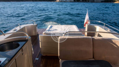 Le bateau dispose d’une grande plateforme de bain arrière, avec de grands bains de soleil, idéals pour profiter du soleil, ainsi que d’un salon avant tout aussi impressionnant pour les passagers en quête d’un espace privé pour se détendre. Son toit rigide est idéal pour se protéger du soleil et des parasols peuvent être installés.